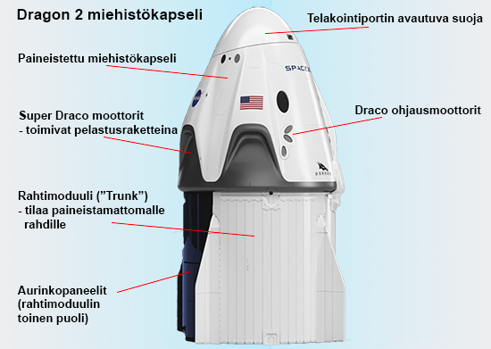 Kaavakuva Dracon 2 kapselista. Kuva SpaceX / avaruuslennot.fi Avaruudessa Dragon 2 koostuu itse miehistökapselista ja sen alle kiinnitetystä rahtimoduulista (tai huoltomoduulista). Tekniikkamoduuli on puoliksi peitetty aurinkokennoilla, jotka tuottavat aluksen tarvitseman sähköenergian. Moduulissa voidaan kuljettaa sellaista rahtia, joka ei tarvitse paineistettua tilaa vaan joka voi olla alttiina avaruuden tyhjiölle ja lämpötiloille. Kahden moduulin yhteiskorkeus on runsaat kahdeksan metriä ja halkaisija neljä metriä. Dragon 2 voi viedä kiertoradalle 6000 kiloa ja tuoda takaisin maahan 3000 kiloa. Palatessaan maahan Dracon irrottautuu ennen ilmakehään saapumista rahtimoduulistaan - joka tuhoutuu kitkan kuumentamana ilmakehässä. Dragon itse hidastaa vauhtiaan lämpökilven suojaamana ja laskeutuu lopulta laskuvarjoilla mereen. Aiemmin esimerkiksi Apollo-alukset laskeutuivat Tyyneen valtamereen, mutta SpaceX aikoo käyttää laskupaikkana Atlantin valtamerta. Dragon 2 on uudelleen käytettävä, eli sama kapseli voidaan huollon jälkeen laukaista avaruuteen uudelleen. Alustavasti Nasa on kuitenkin halunnut jokaiselle lennolle uuden kapselin, mutta uudelleenkäyttö voisi tuoda merkittäviä kustannussäästöjä. Tarvikkeiden täydennyskuljetuksissa Kansainväliselle avaruusasemalle SpaceX korvaa vanhan Dragon 1 version uudella Dracon 2 rahtiversiolla. Sen on tarkoitus olla mahdollisimman identtinen miehistöversion kanssa, mutta ilman istuimia, ohjauslaitteita ja -näyttöjä, ja muita ihmisille tarkoitettuja laitteita ja rakenteita. Eikä kapselissa ole Super Draco raketteja, joita käytetään miehistöversiossa siinä tilanteessa, että kapseli on saatava turvaan kantoraketin toimintahäiriön takia. Dragon 2 rahtiversion on tarkoitus tehdä ensilentonsa vuoden 2020 loppuolella.